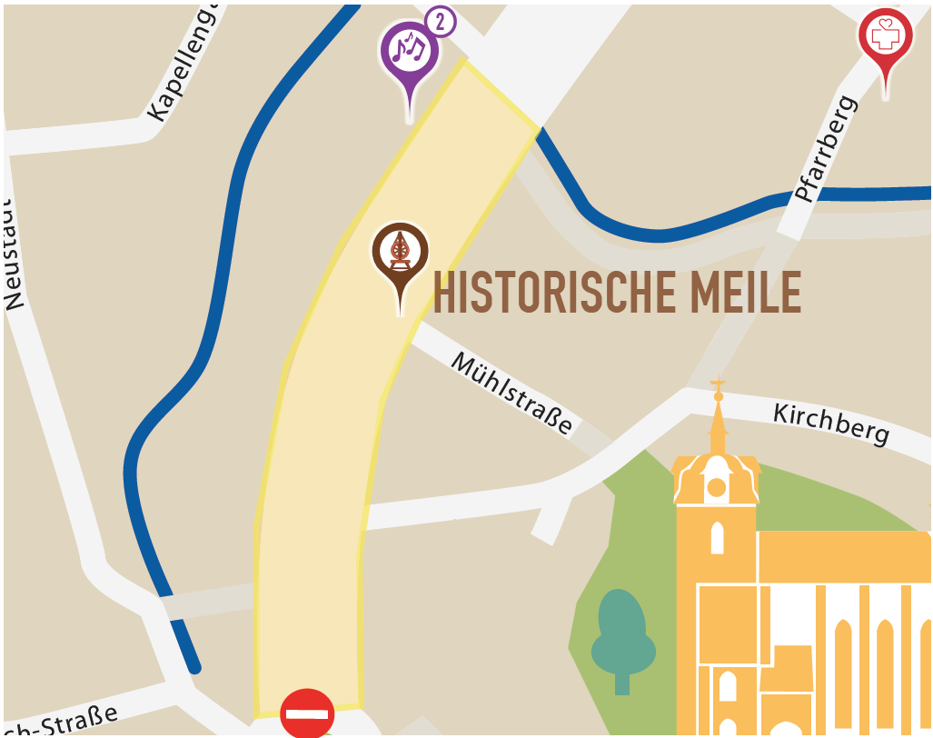 über Mühlstraße und Kirchberg Zugang zur Kirch- und Museumsmeile